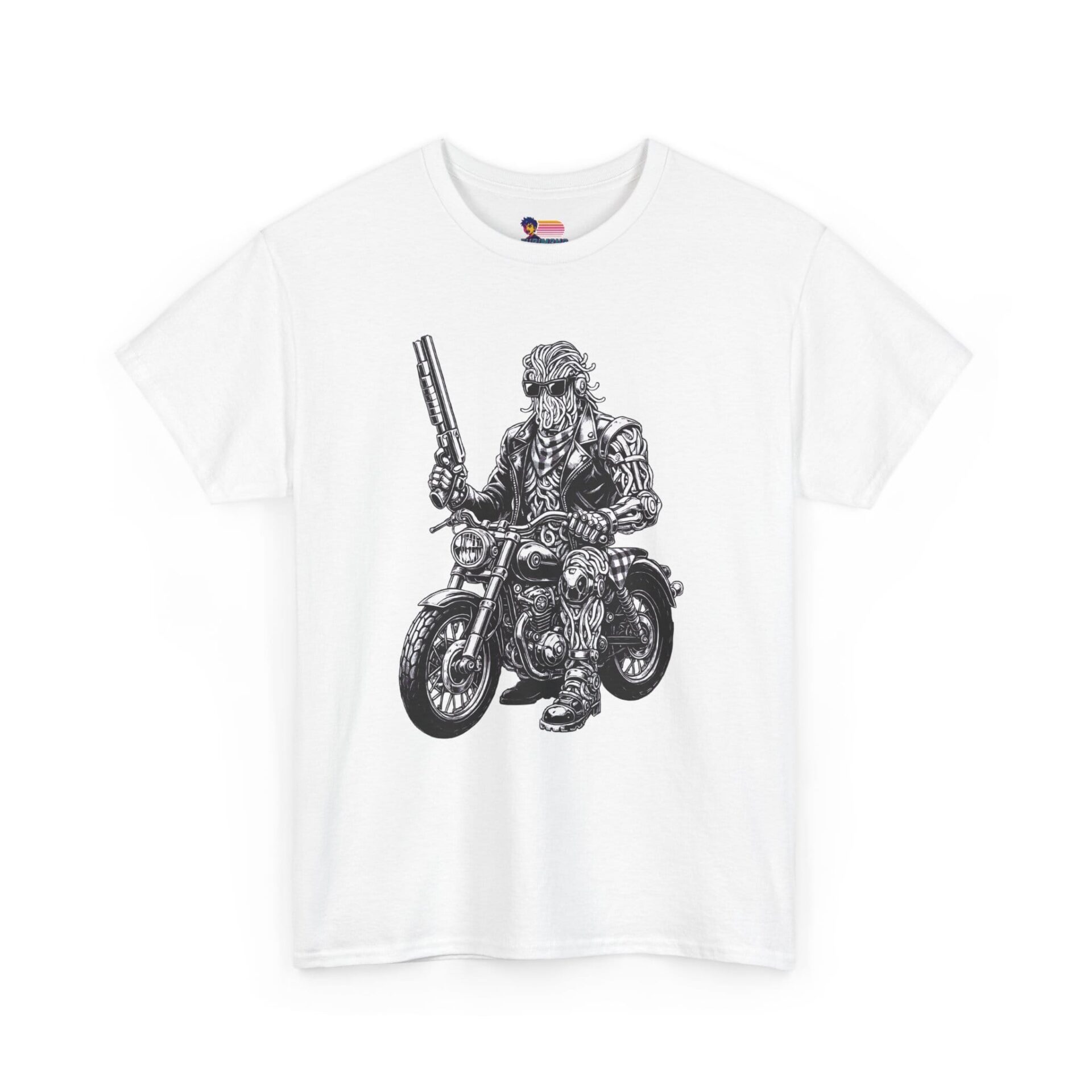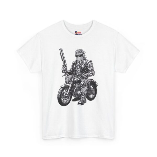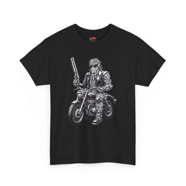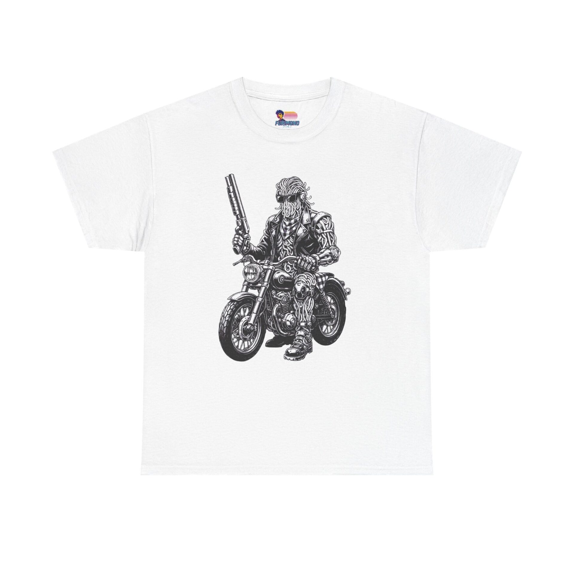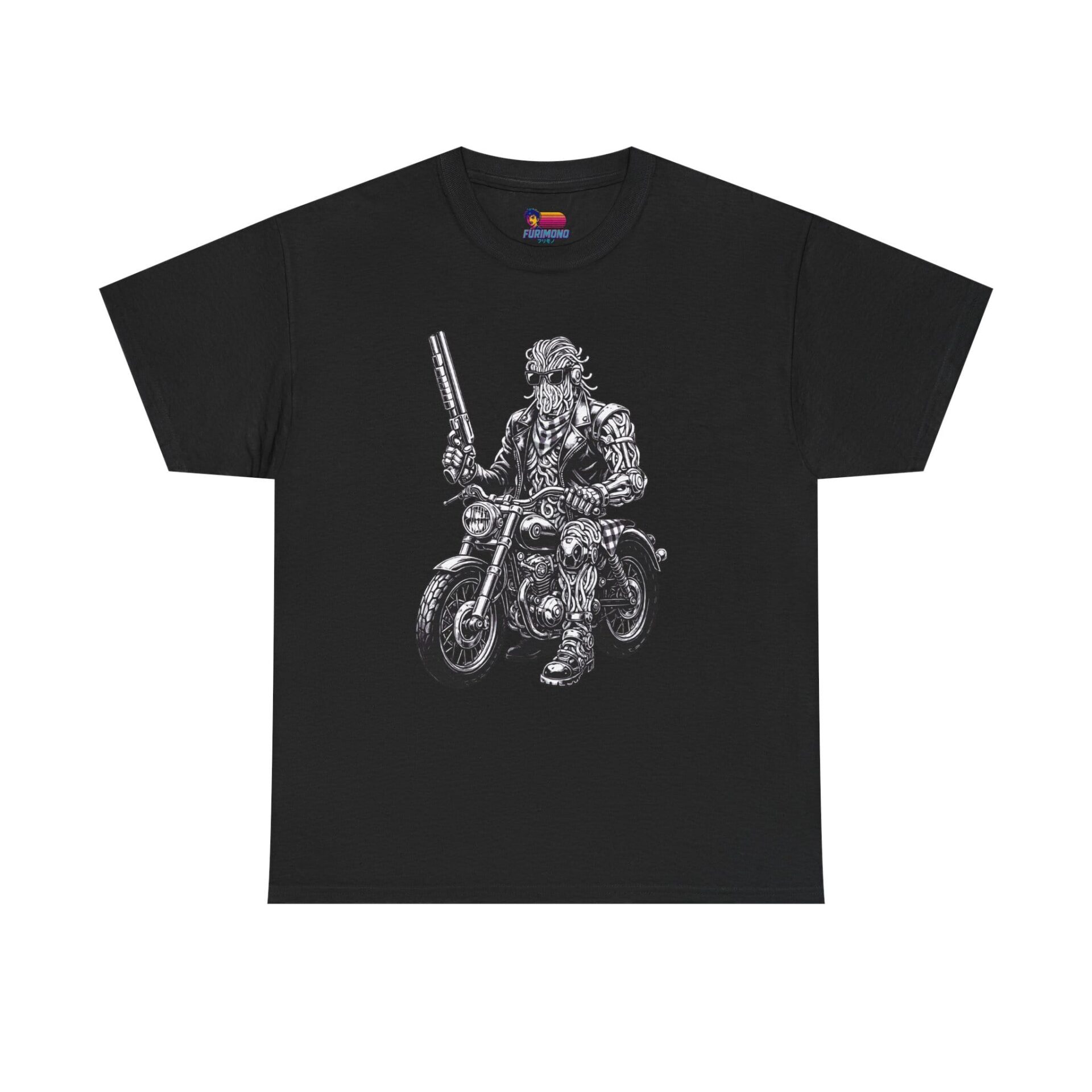 This tee channels gritty road-worn attitude with finely detailed black-and-white artwork of a leather-clad rider perched on a classic motorcycle, handgun casually held. It reads like a still from a midnight open road story — rough edges, silent engines, and a quiet readiness to ride. The medium-weight cotton feels substantial but breathable, and the tubular knit construction keeps the silhouette clean and unfussy. Wear it with a denim jacket, boots, and a low-slung belt for nights at the garage, weekend rides, or when you want your outfit to speak in a low, unbothered voice.