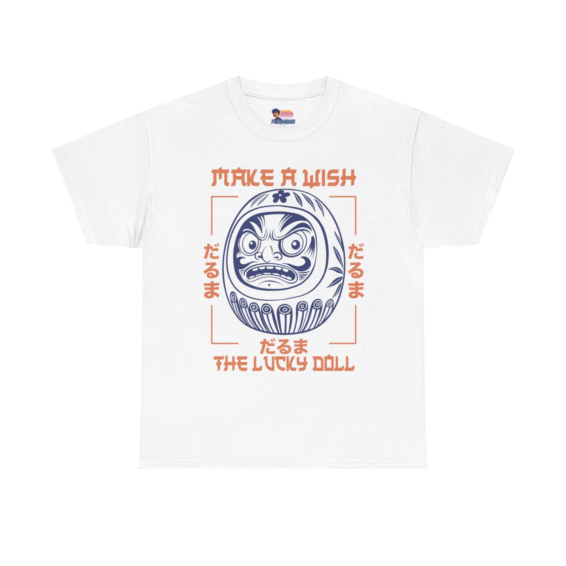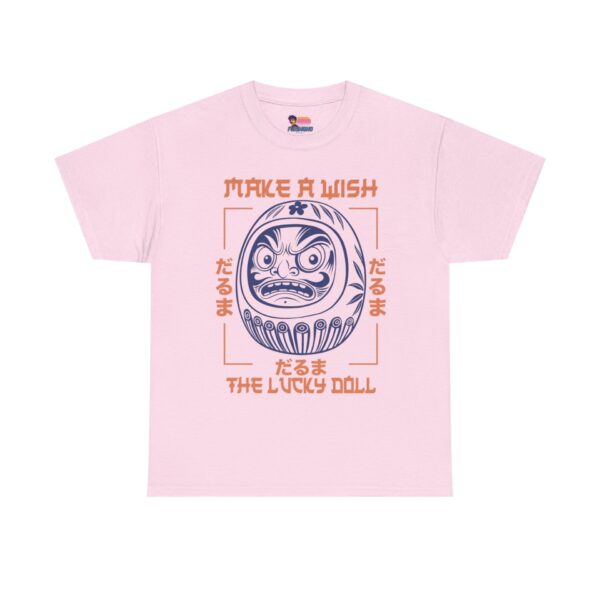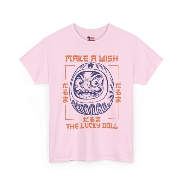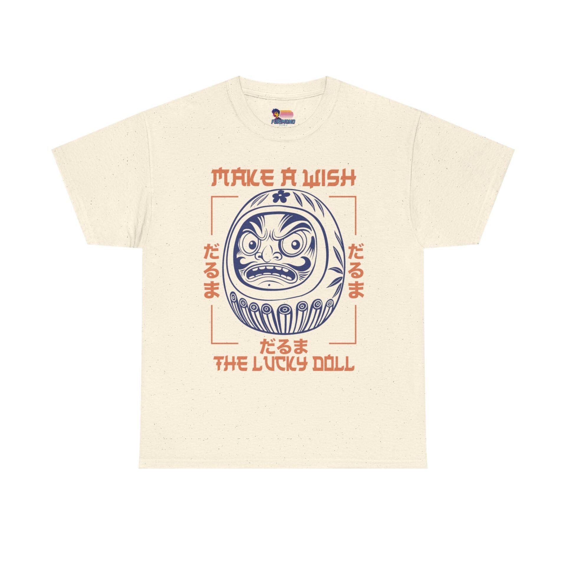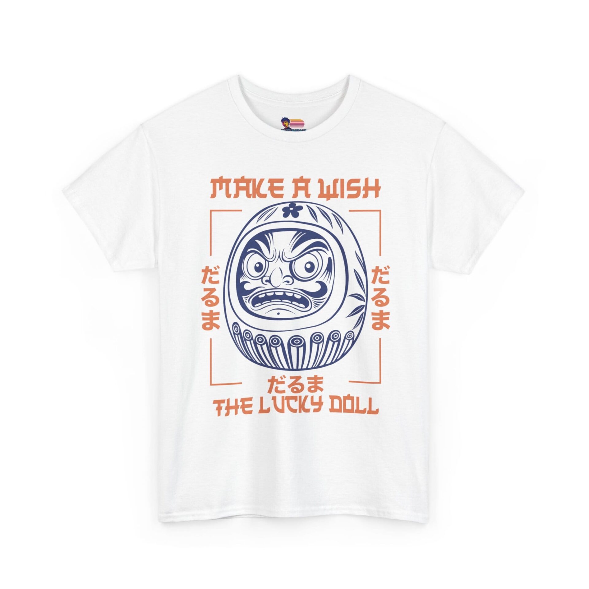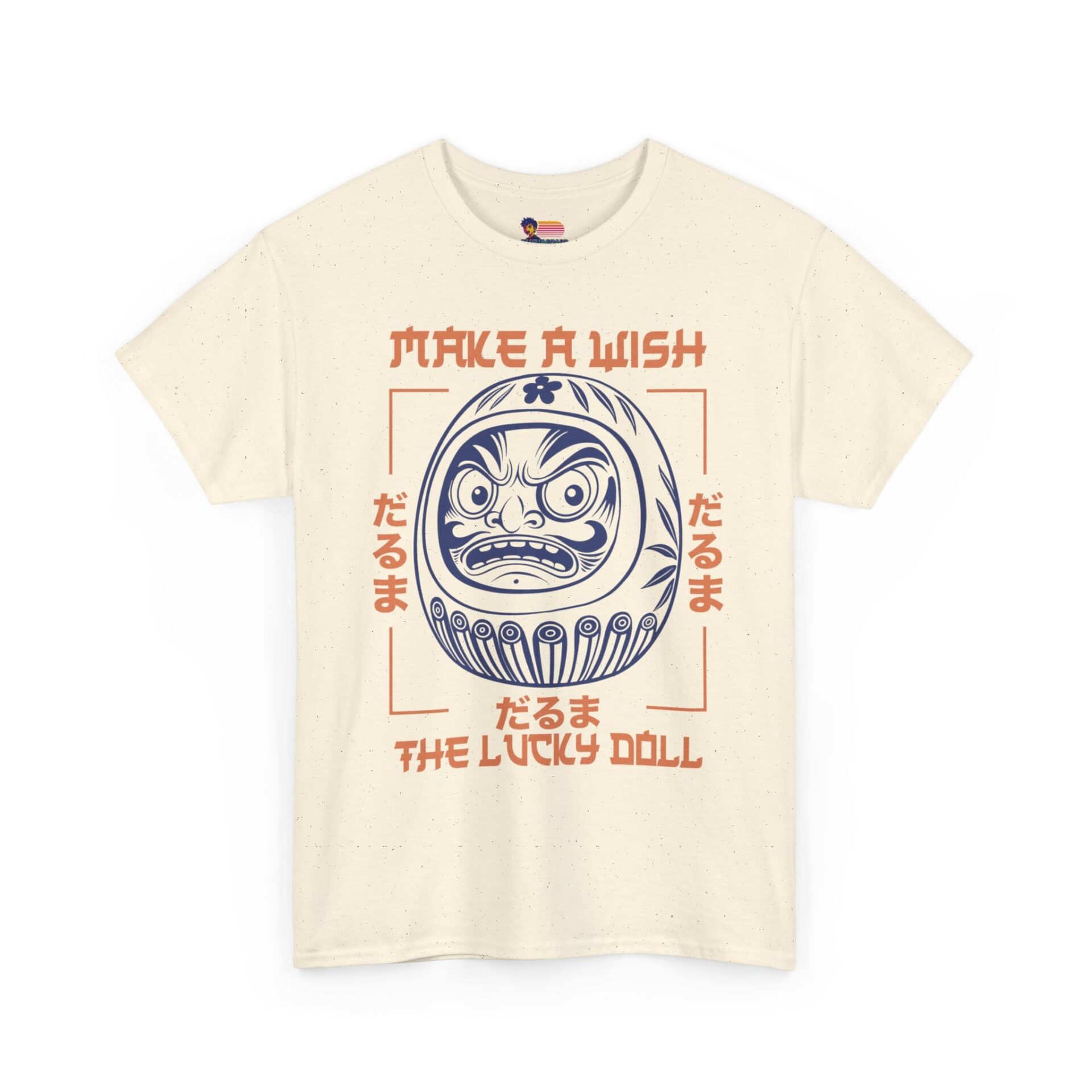 This classic crew-neck tee brings a quiet, cultural charm to everyday wear. At its center sits a bold daruma illustration — a traditional Japanese lucky doll — rendered in crisp navy linework with soft coral accents and framed by hand-drawn type that reads “Make a Wish / The Lucky Doll.” Short, confident sleeves and a relaxed fit make it an easy layer for city strolls, creative workdays, or late-night meetups. The cotton has a smooth surface that keeps the print detailed and vibrant, while a ribbed collar and shoulder tape preserve shape through repeated wears. Lightweight but substantial, it feels familiar from the first wear and ages with character, not compromise.