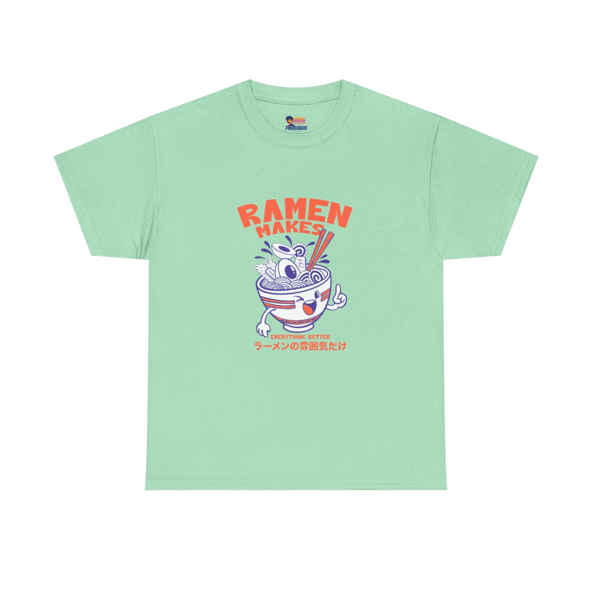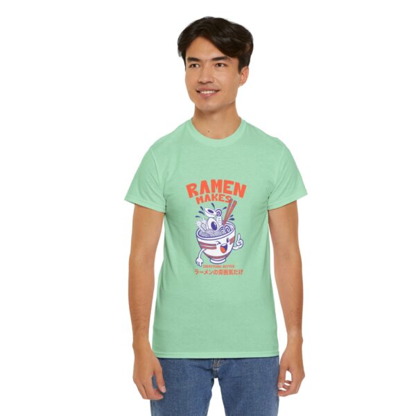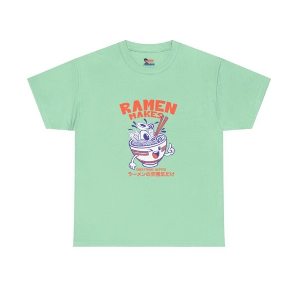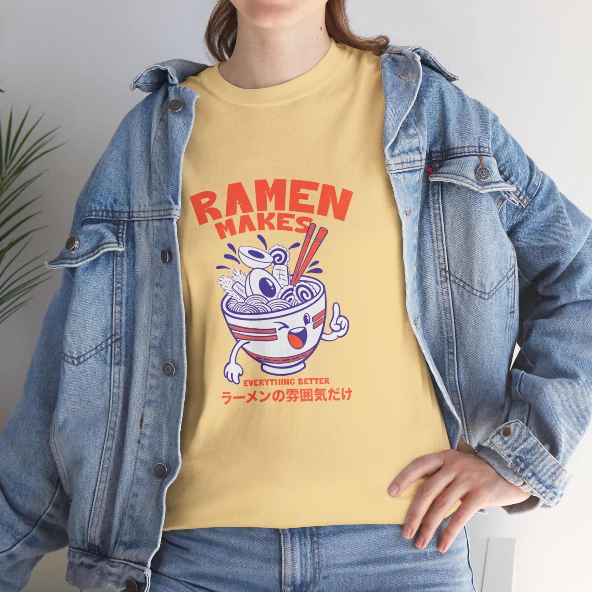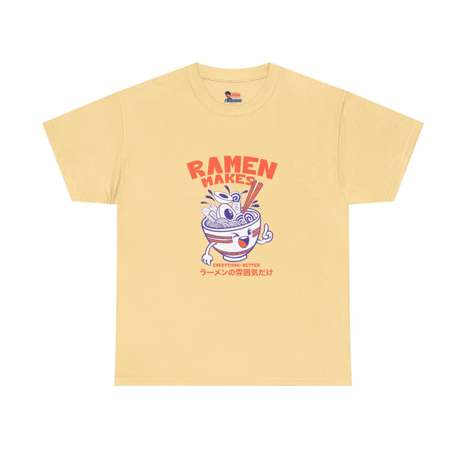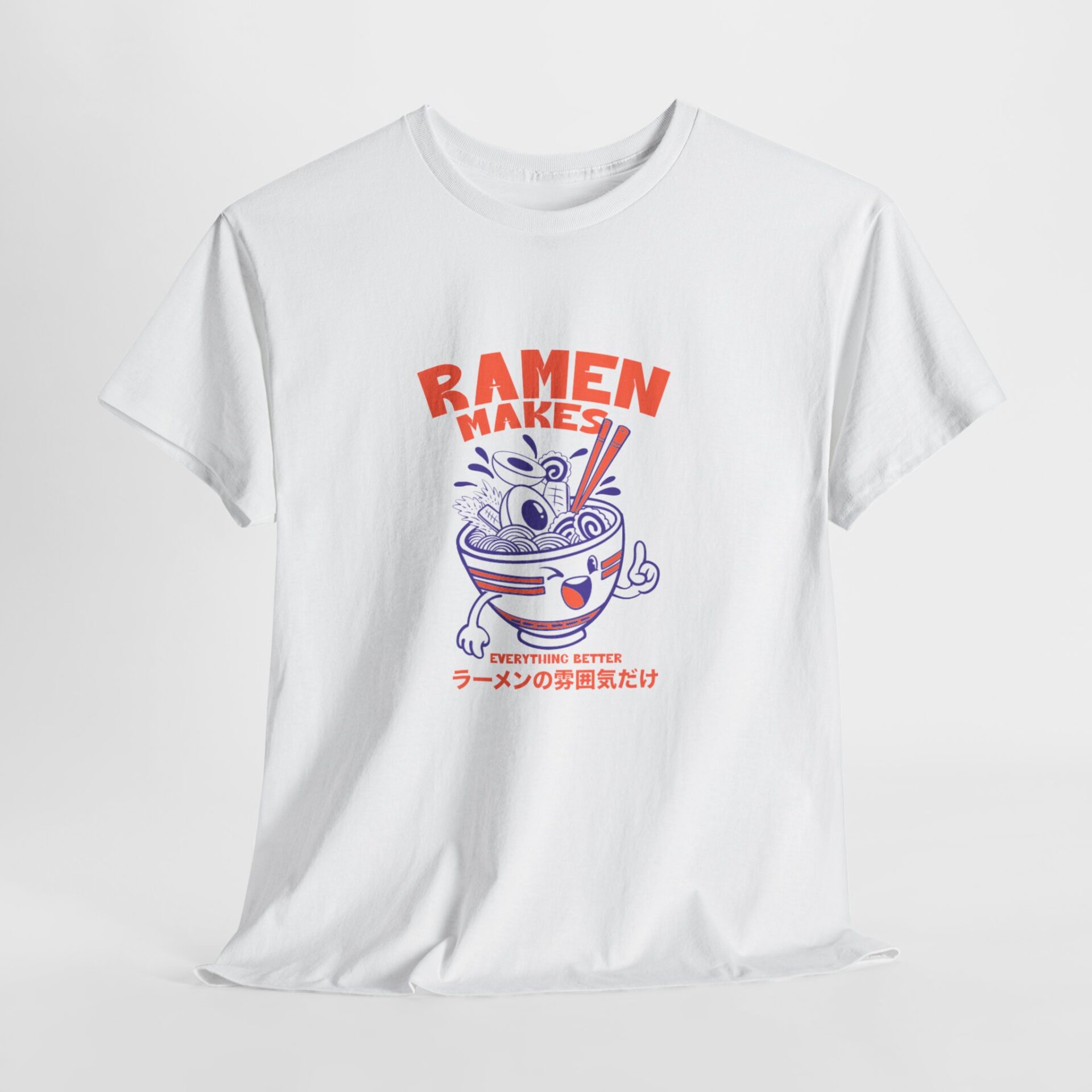 This soft, classic-fit tee brings playful ramen energy to everyday wear. The front features a cheerful illustrated ramen bowl—complete with chopsticks, noodles, and a mischievous face—in bold red and indigo tones with small Japanese text beneath, giving a cozy, street-style vibe. Lightweight but sturdy 100% cotton (solid colors) drapes comfortably, while the ribbed collar and shoulder tape keep the shape after many washes. Wear it to noodle nights, markets, or casual hangs when you want a little culinary humor in your outfit.