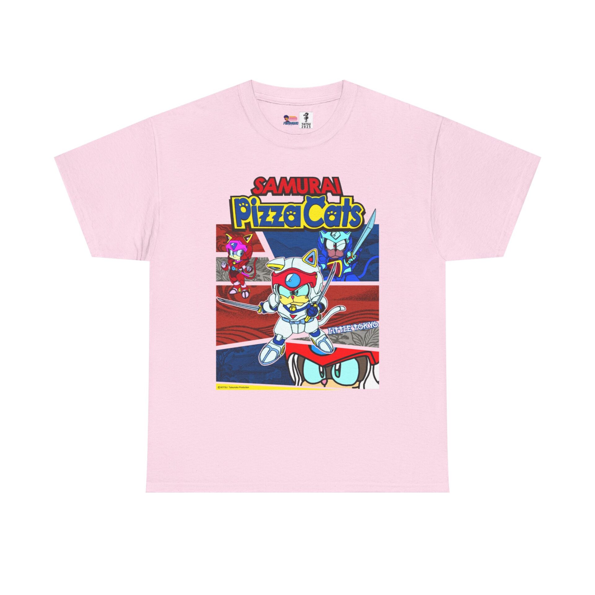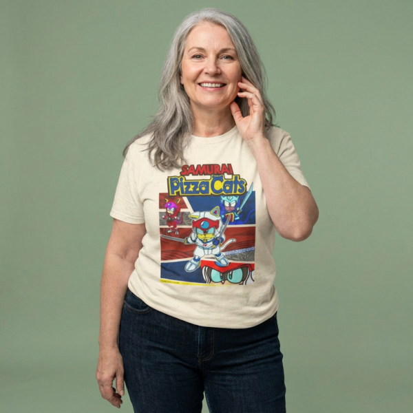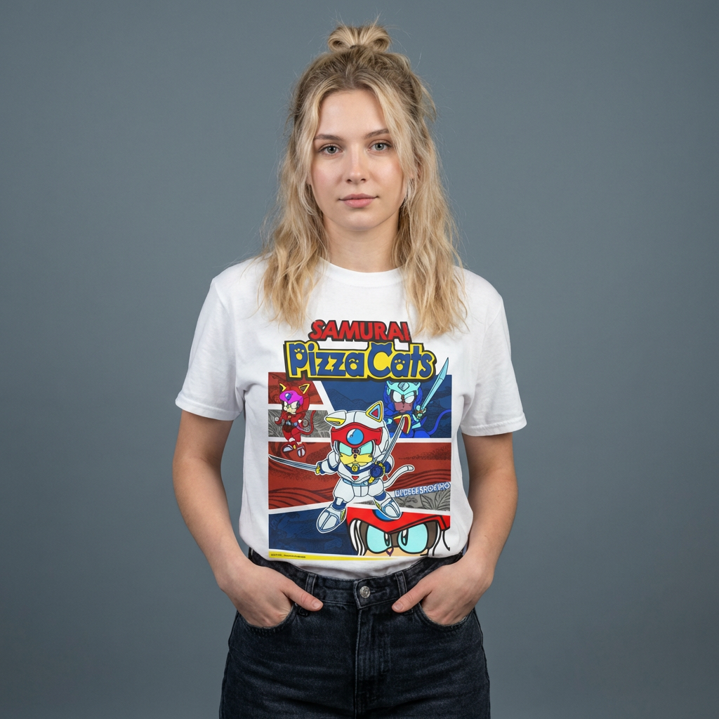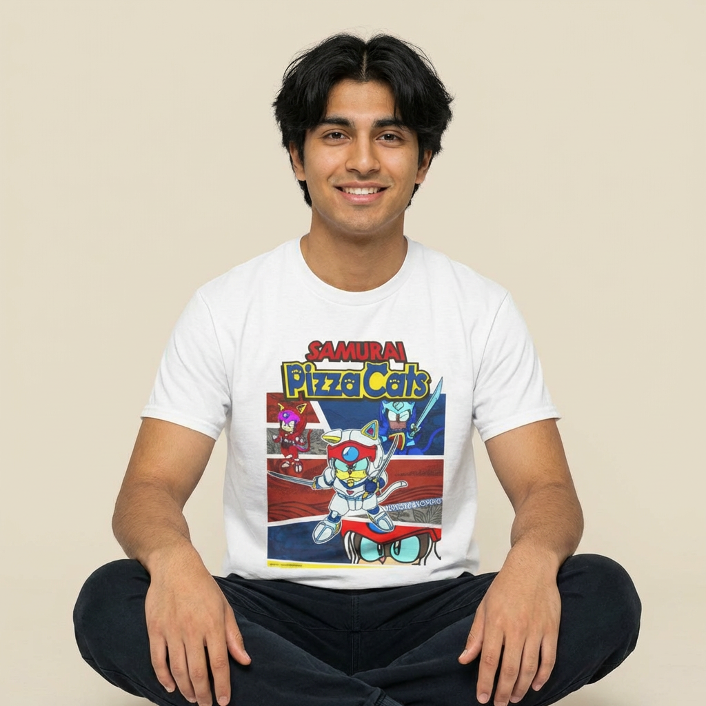 Bright, playful, and a little bit nostalgic — this cotton tee brings a comic-book energy to everyday wear. A bold, colorful front print shows adventurous cartoon cats in samurai armor racing across a stylized cityscape, giving the shirt a retro arcade vibe. The classic crew neck and relaxed cut let the graphic take center stage while staying comfortable for long wear. It layers easily under a jacket or stands out on its own during casual meetups, gaming nights, or pop-culture conventions. Built to last and soft to the touch, this tee feels like something you’d reach for when you want to show fandom with a wink and a grin.