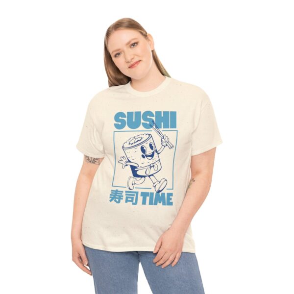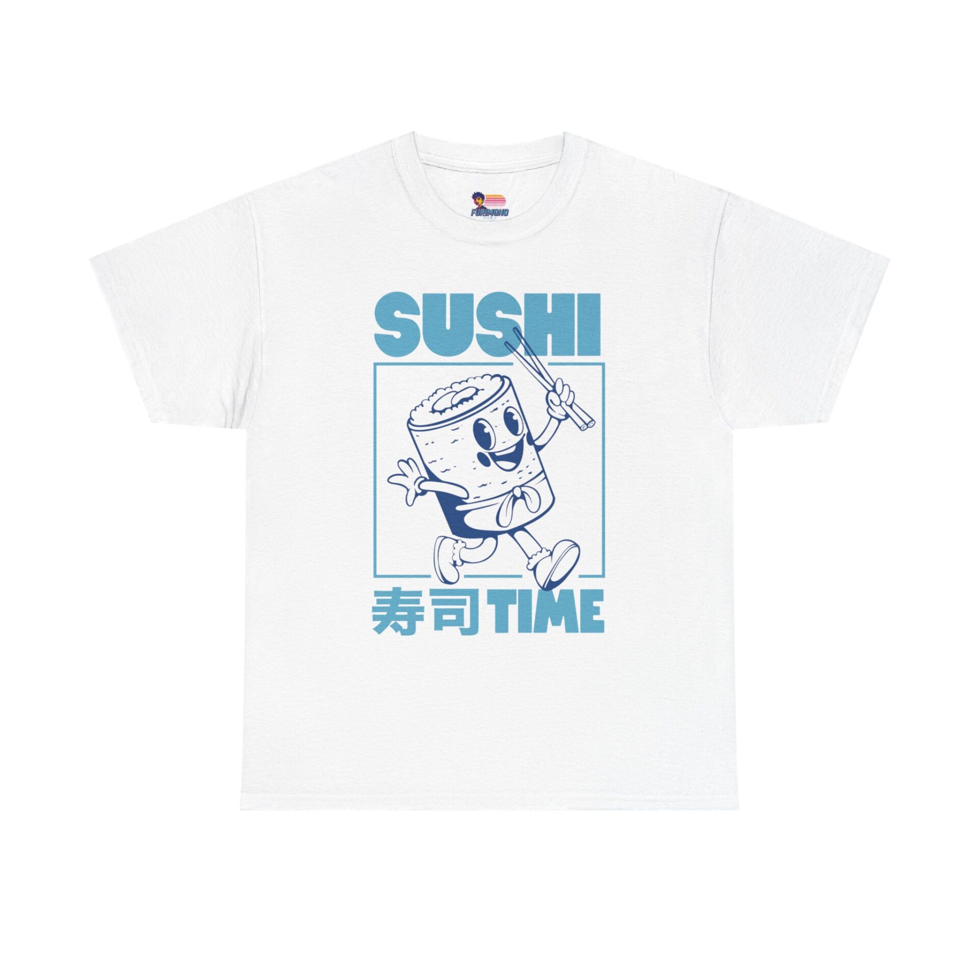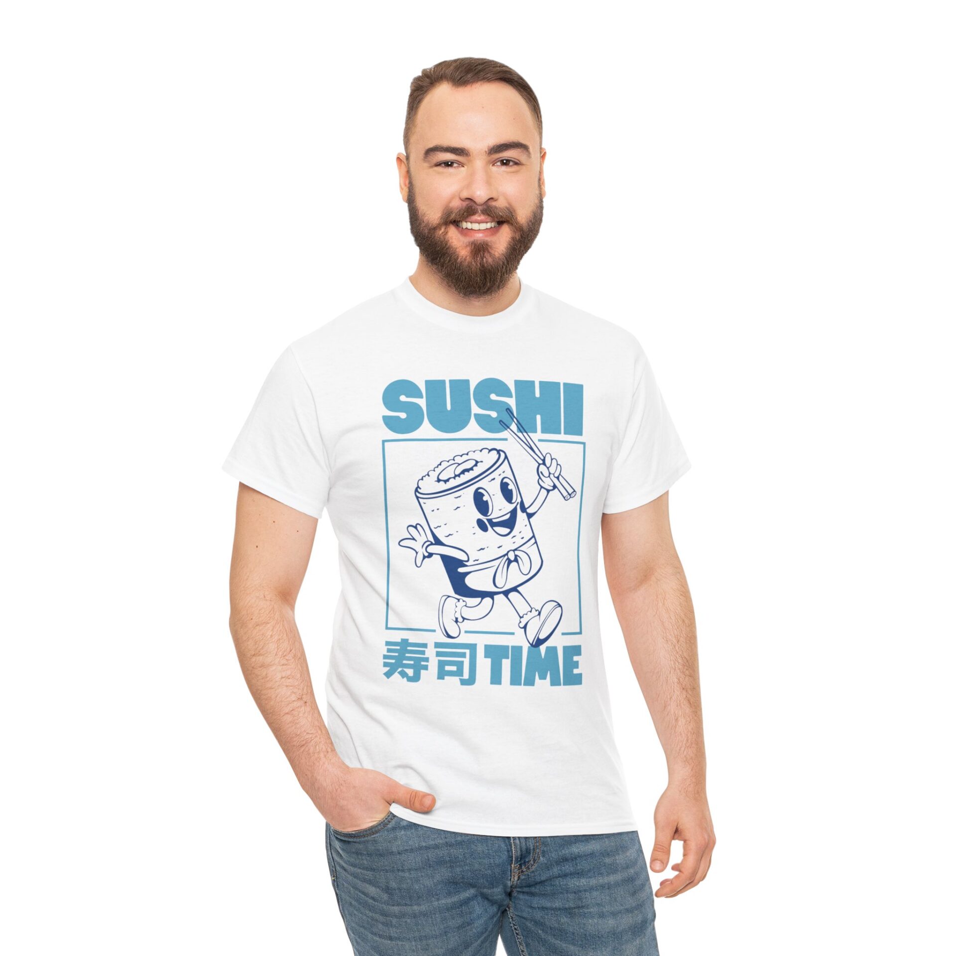 A soft, breathable cotton tee that brings playful sushi vibes to everyday wear. The white classic-fit shirt features a cheerful, retro-style graphic of a running sushi roll holding chopsticks, framed beneath bold “SUSHI” lettering and Japanese characters. Lightweight but durable, the medium-weight fabric keeps shape wash after wash while the ribbed collar and shoulder tape add structure and comfort. Wear it to casual meetups, food runs, or low-key city wandering — it’s an easy way to show your love for sushi culture with a lighthearted, vintage cartoon edge.